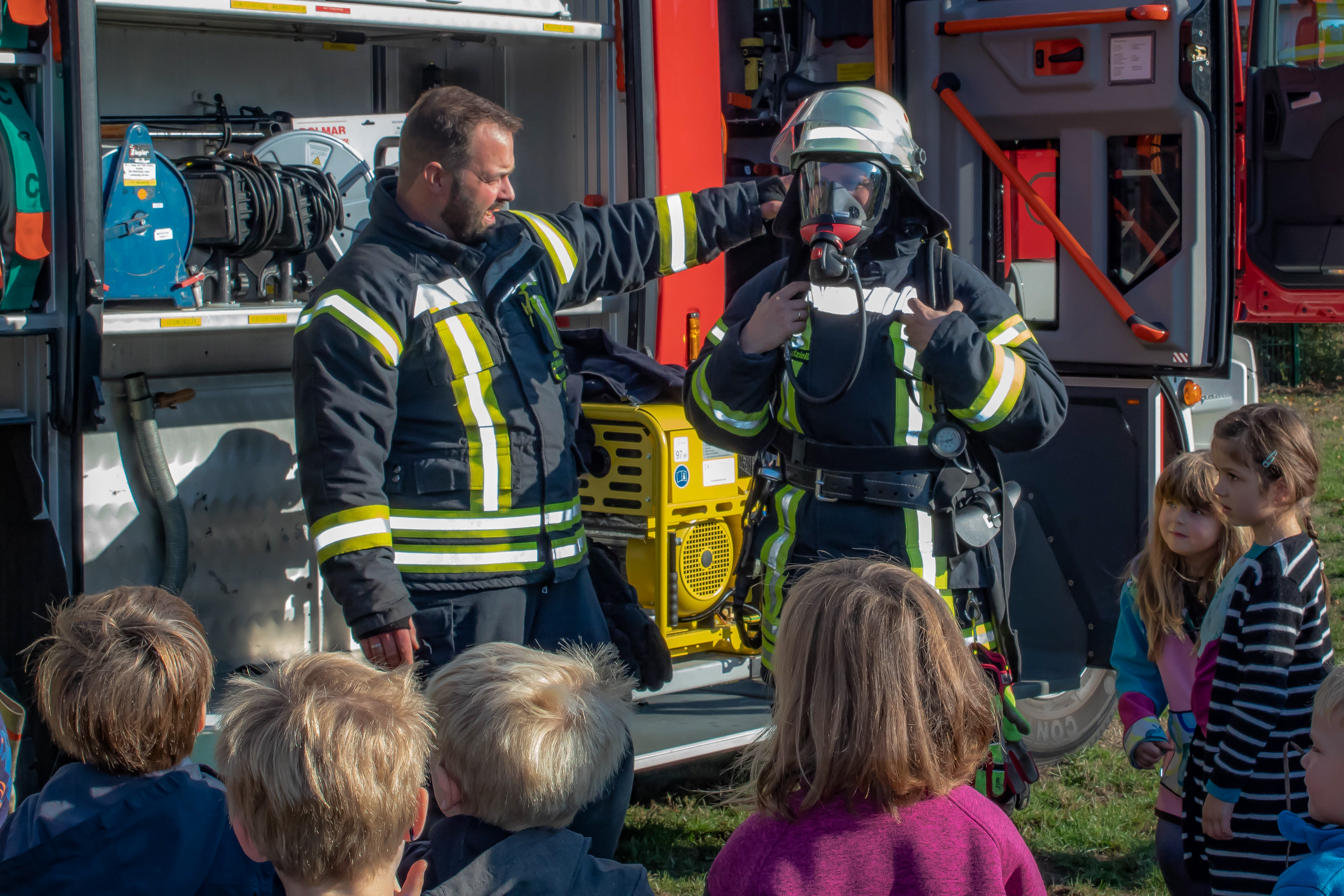 Als es dann hieß, wir werden nach draußen gehen und uns die Feuerwehrautos angucken war auch bei den letzten Kindern die Schüchternheit wie nie dagewesen. Alle durften mal mit dem kleinen Strahlrohr spielen, in die Autos klettern, alles anfassen und unsere Einsatzuniform tragen.