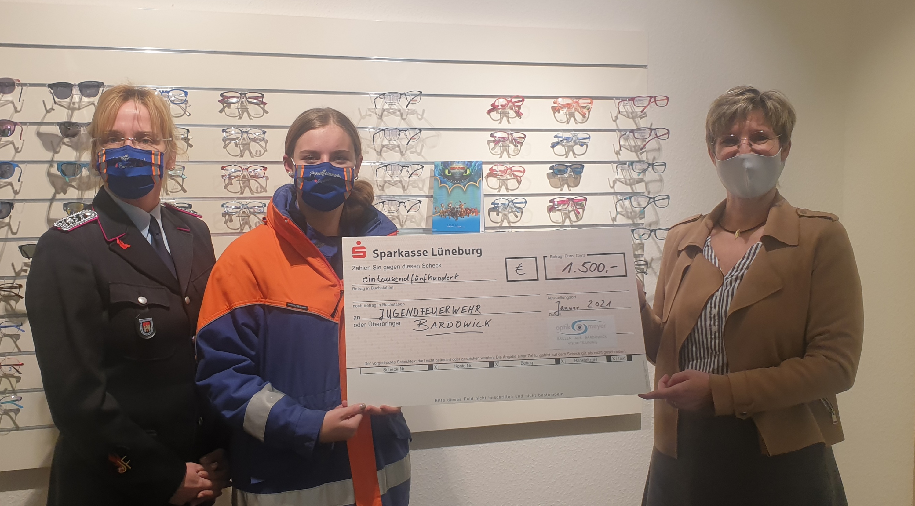 Die Jugendfeuerwehr Bardowick durfte sich zu Jahresbeginn über eine großzügige Spende von Optik Meyer und seinen Kunden freuen. Vergangenes Jahr beschloss die Bundesregierung die Mehrwertsteuersenkung von 19% auf 16%. Der Inhaber Stefan Meyer überließ seinen Kunden die Entscheidung, ob sie selber von der Senkung profitieren wollen oder ob die Differenz an die Jugendfeuerwehr gespendet werden soll. Viele seiner Kunden haben sich für die Spende entschieden. Somit kam nach knapp einem halben Jahr schon eine vierstellige Summe zusammen, die von Optik Meyer dann auf 1500 Euro aufgerundet wurde. Am 12.01 übergab Inhaberin Birgit Meyer symbolisch den Spendenscheck an Jugendwartin Sabine Schulz und Jugendsprecherin Maxima Schneider. Wir möchten uns ganz herzlich bei Stefan und Birgit Meyer, sowie ihren Kunden bedanken.